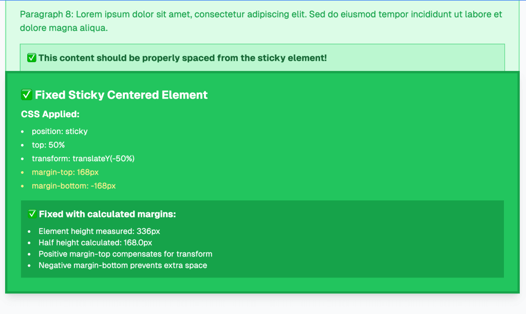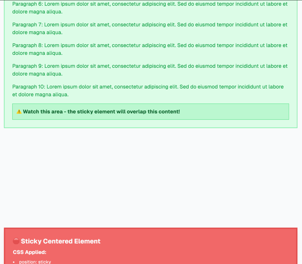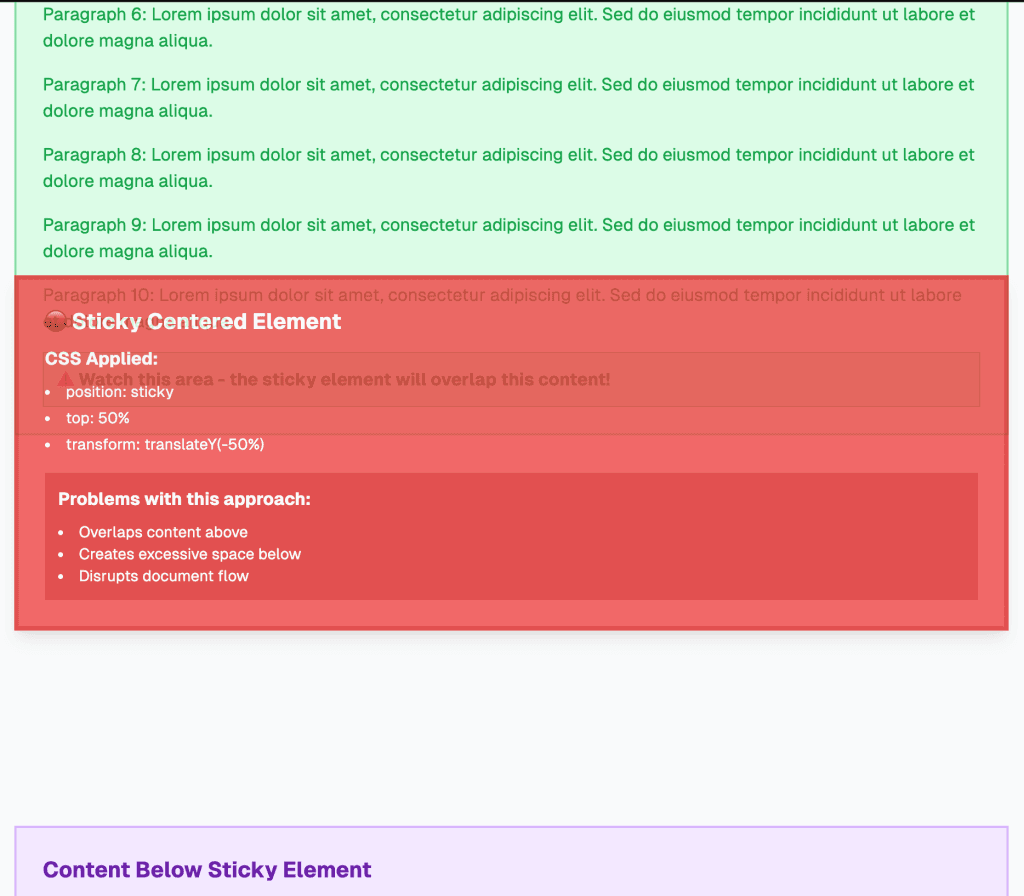 If you look at the above example, the sticky element is now overlapping the element above it by 50% of it's height. This is a side effect of the transform: translateY(-50%) which moves it out of the normal flow of the document.